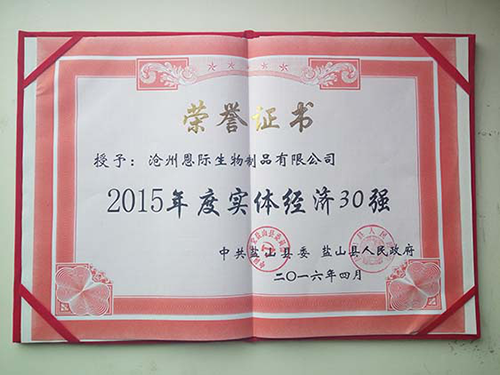 熱烈慶祝滄州恩際生物制品有限公司榮獲2015年度實體經濟30強榮譽